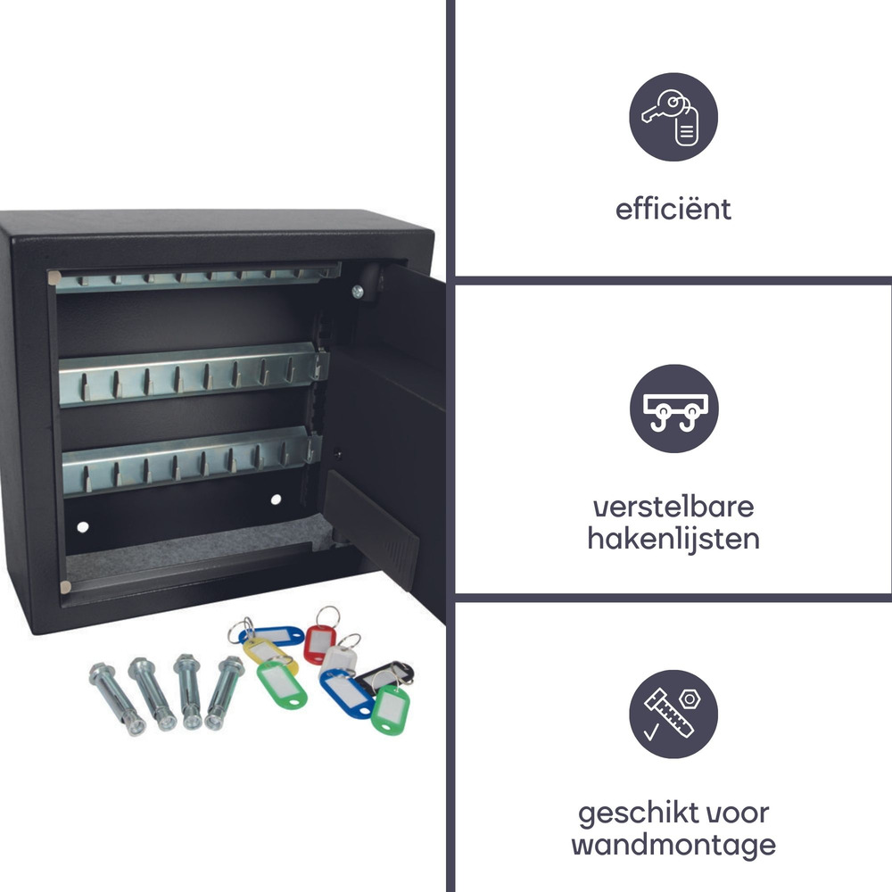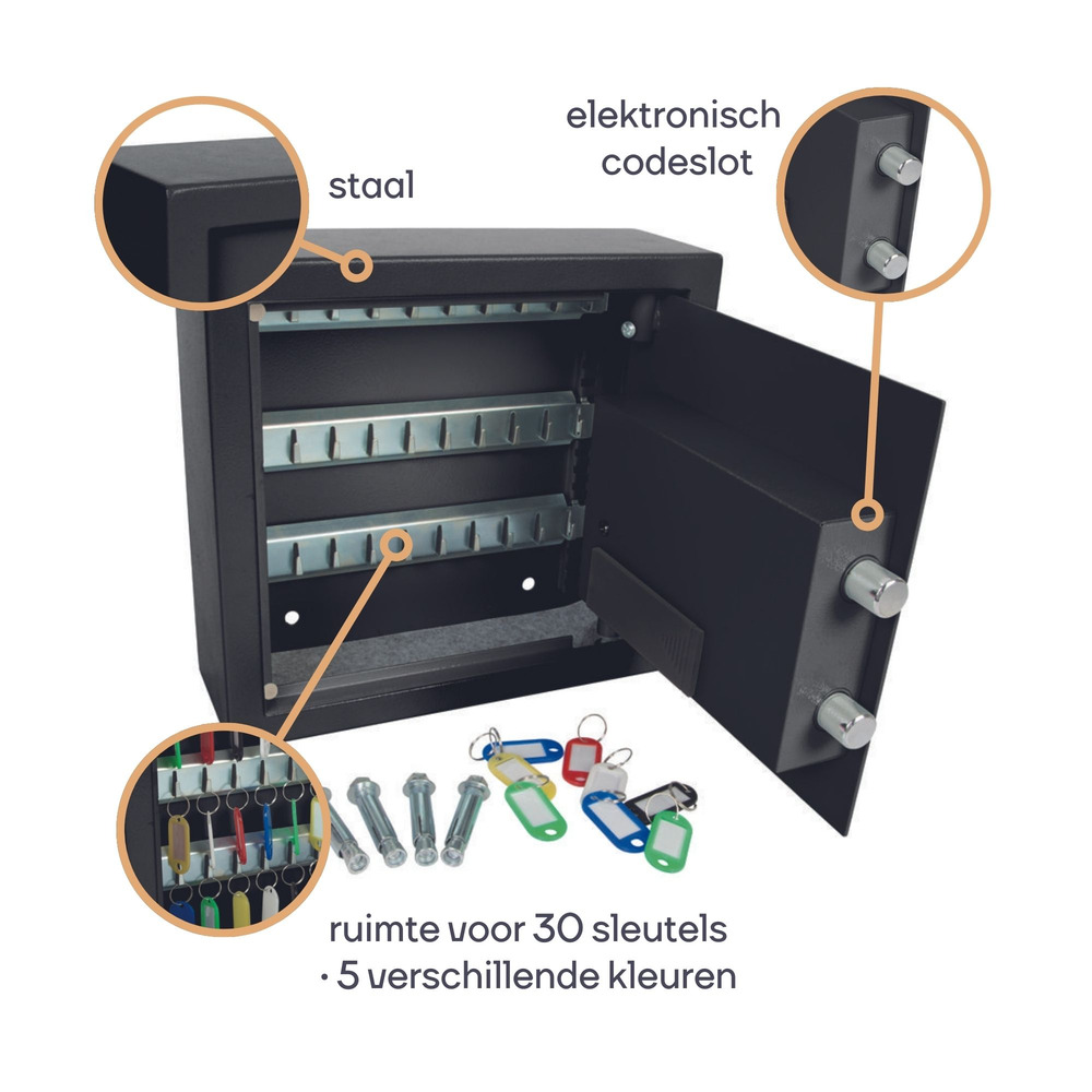 Experience organized security with the Sleutelkluis, designed to hold 30 keys within its 28x30x10 cm dimensions. Crafted for efficiency, this secure key cabinet ensures quick access and safe storage.
