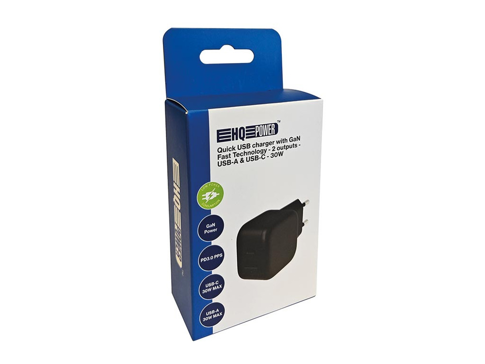 Charge your devices faster than ever with the Snelle USB-oplader, equipped with advanced GaN Fast Technology. This compact charger offers dual output ports: USB-A and USB-C, delivering a powerful 30W total capacity.