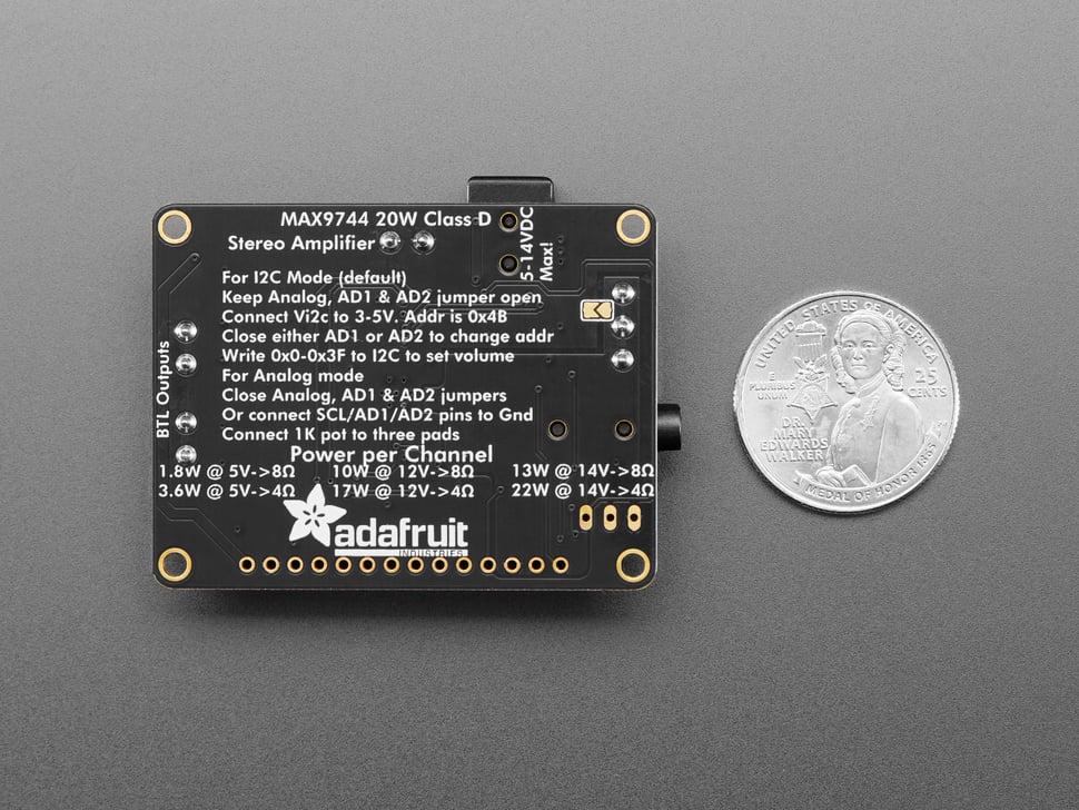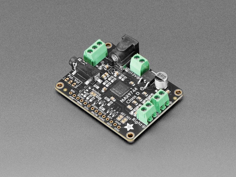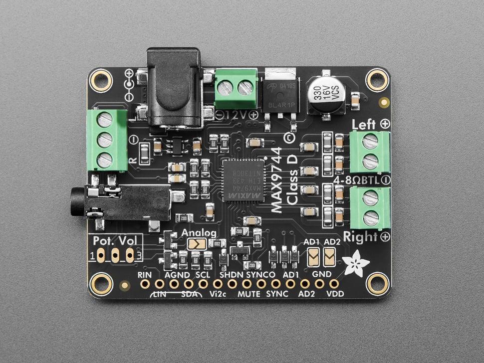 At its core lies the versatile MAX9744 amplifier, offering both analog and digital volume control. Adjust volume with the included 1KΩ pot for an old school feel or connect to a microcontroller to set 64 steps of volume amplification using I2C commands.