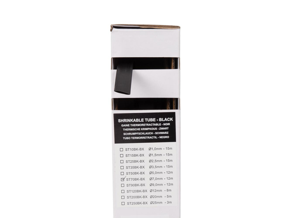 Thermische krimpkous 2:1 - 7.0 mm - zwart - 12 m - doos biedt betrouwbaarheid en veelzijdigheid in elektrische verbindingen. Geproduceerd uit hoogwaardig polyolefine, biedt deze buis superieure bescherming tegen mechanische schade en corrosie.