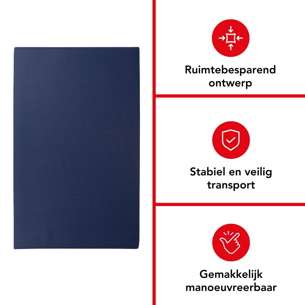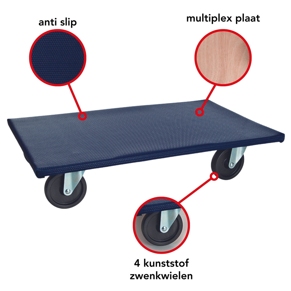 Een blauwe antisliplaag zorgt ervoor dat je lading veilig op zijn plek blijft tijdens transport. De roller maakt het mogelijk om meubels met gemak te verplaatsen door smalle doorgangen en krappe bochten in huis of kantoorruimtes.