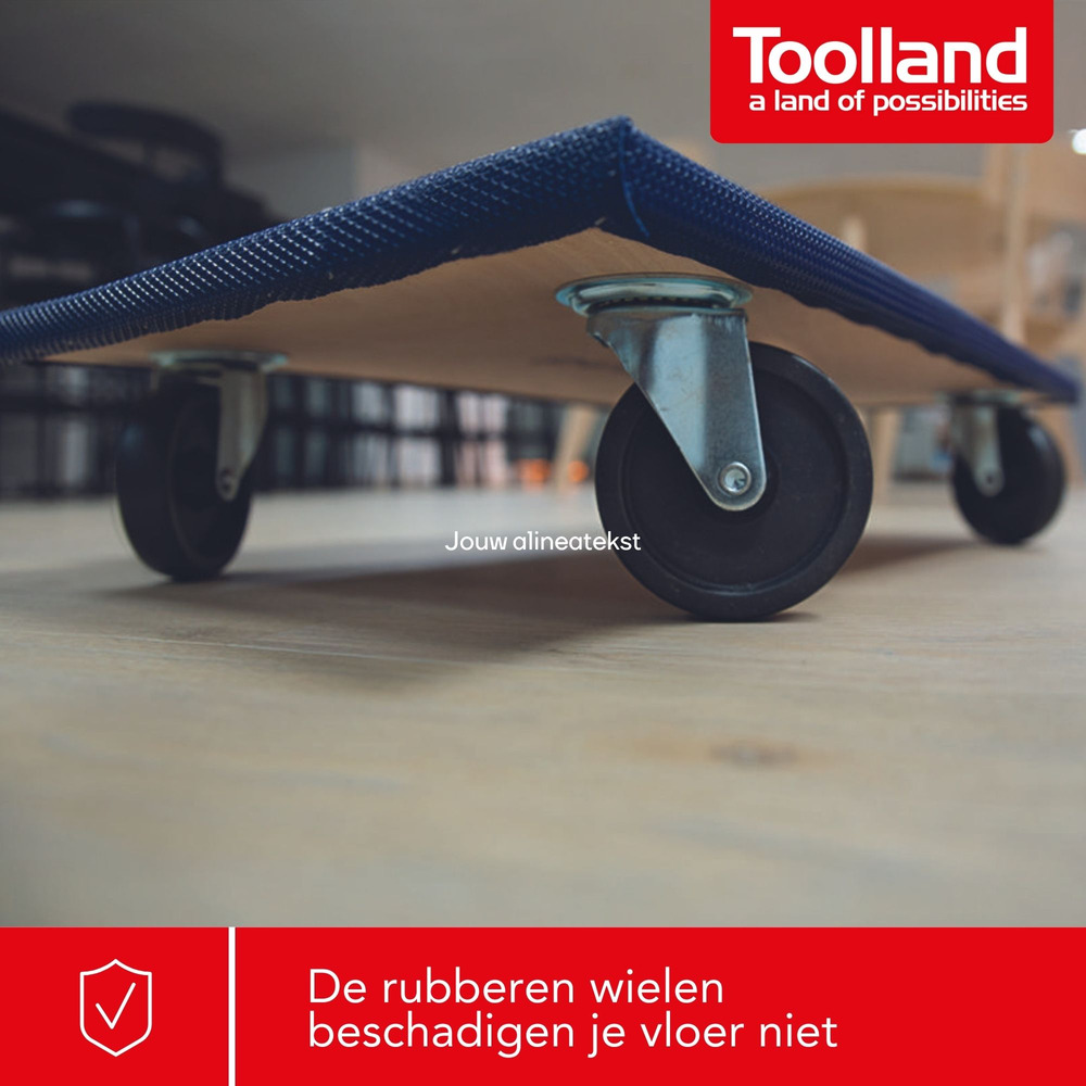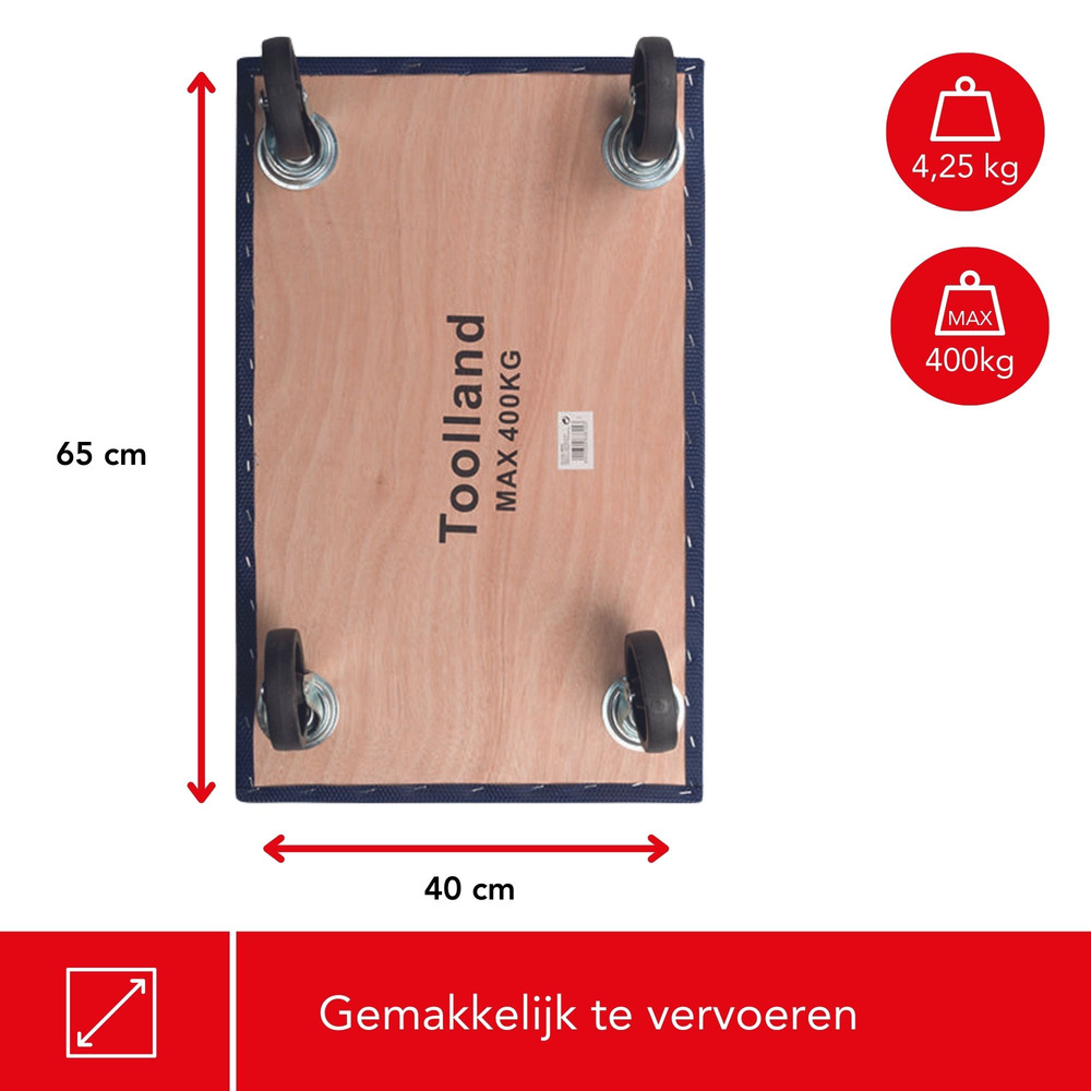 Deze rechthoekige meubelroller van Toolland meet 650 x 400 mm en biedt betrouwbare ondersteuning voor het verplaatsen van zware objecten tot 400 kg. De houten triplex plaat is stevig en duurzaam, perfect voor langdurig gebruik.