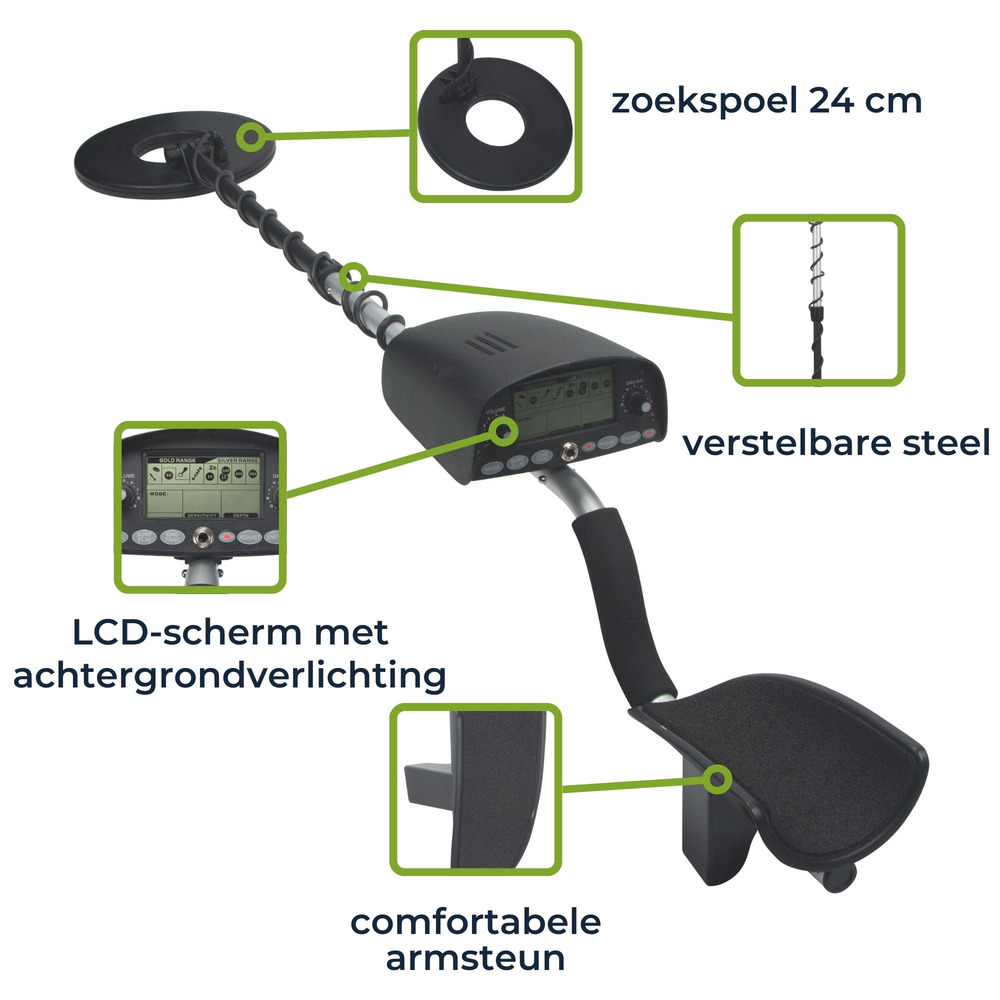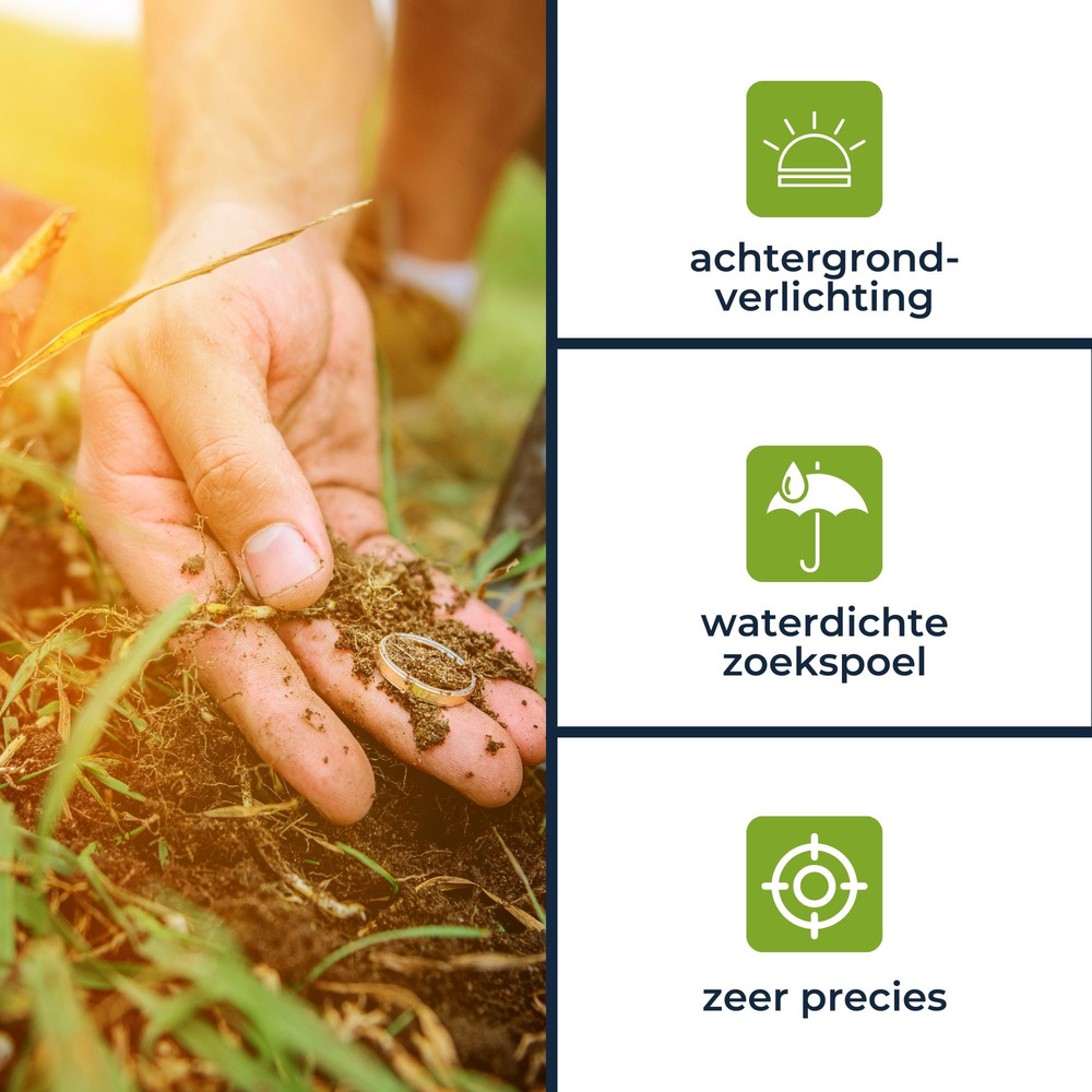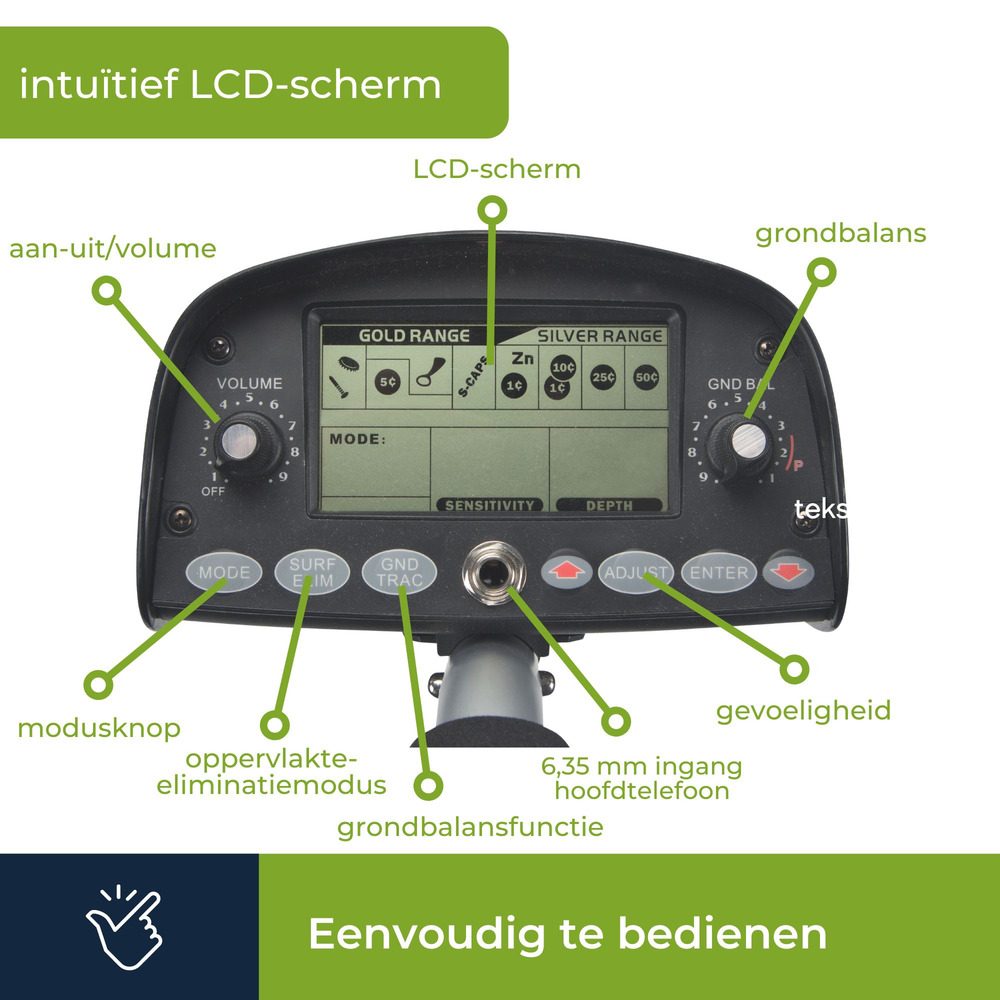 Het grote LCD-display geeft duidelijke informatie over de gedetecteerde voorwerpen en diepte. U kunt snel en nauwkeurig onderscheid maken tussen verschillende metalen dankzij de regelbare discriminatie en notch-functies. De gevoeligheidsregeling zorgt voor precisie, zelfs in complexe bodemomstandigheden.