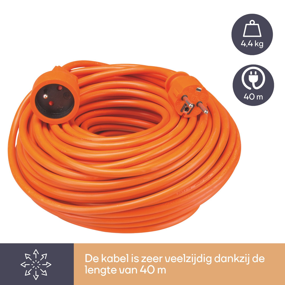 The Verlengkabel is a robust 40-meter extension cord in a vibrant orange color, ensuring high visibility for safety in any environment.