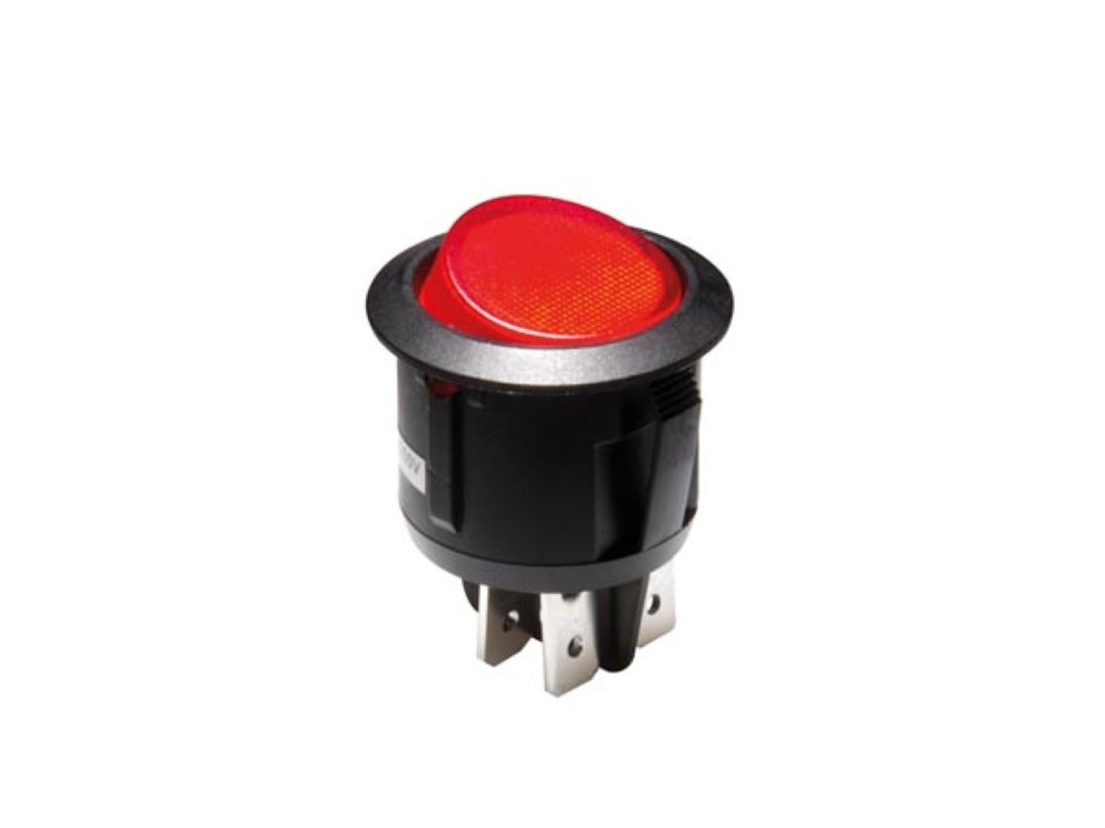 The Verlichte Rockerschakelaar features a red illuminated switch, designed to enhance visibility in low-light conditions. This 2P/ON-OFF switch offers dependable performance with easy operation.