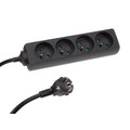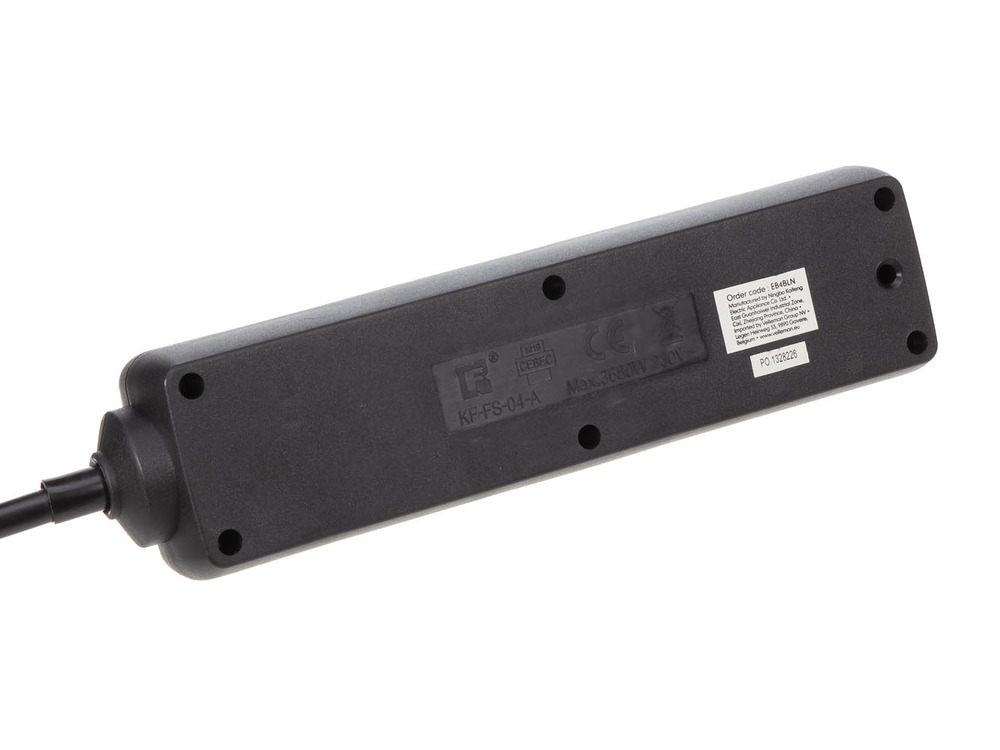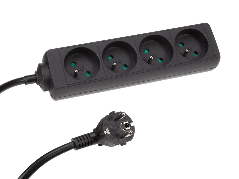 This versatile 4-way power strip features a 1.5-meter cord and is designed in sleek black with grounded connections for enhanced safety.