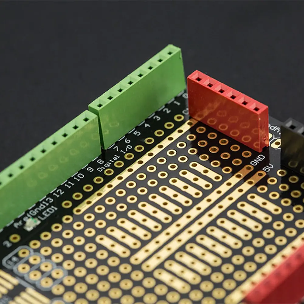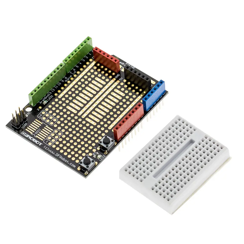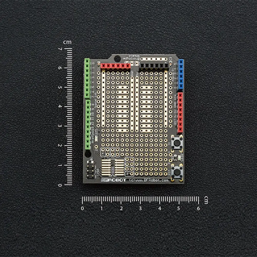 Another highlight is the special coded pin header by DFRobot, simplifying connections with color-coded pins: red for power, black for ground, green for digital, and blue for analog. It's like having a color-coded map in a bustling city, making navigation intuitive and straightforward. Furthermore, the conveniently placed reset button streamlines the debugging process, ensuring that tweaking and perfecting your project is a seamless experience. With this prototyping shield, innovation is no longer just a concept—it's a hands-on reality.