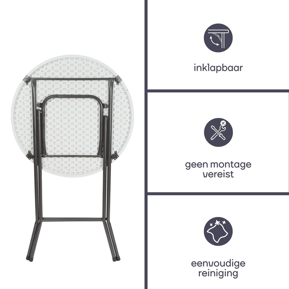 Experience versatility and style with the VOUWTAFEL ROND, crafted at a sleek 80 x 110 cm. This round folding table is an elegant solution for compact spaces and spontaneous events.