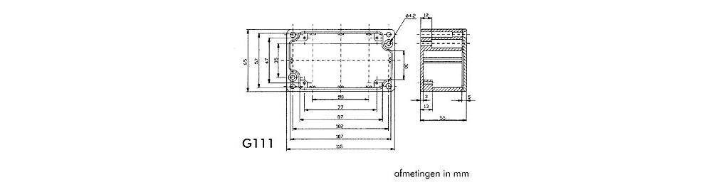 De schroefgaten zijn uitgerust met draadbussen en de dekselschroeven zijn verzonken, wat zorgt voor een strak en professioneel uiterlijk. Met 2 of 4 openingen biedt deze behuizing flexibele opties voor horizontale PCB-montage, waarbij alle functionele vereisten worden bewaard. Dit maakt het een veelzijdige oplossing voor diverse technische toepassingen.