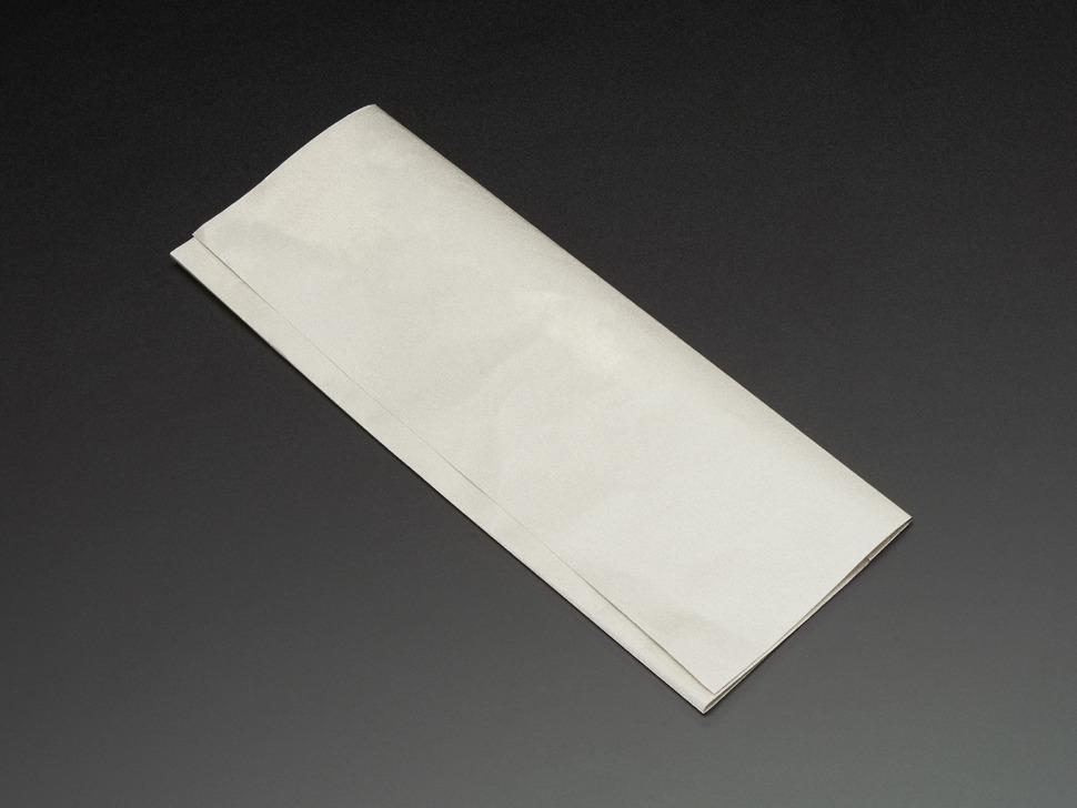 This woven conductive fabric is silver-colored and crafted from Copper+Nickel-plated polyester. Use small pieces for soft switches, plush keypads, capacitive touch sensors, and other textile interfaces. Its exceptional conductivity exhibits a resistance of less than 1 ohm per foot in any direction across the textile.