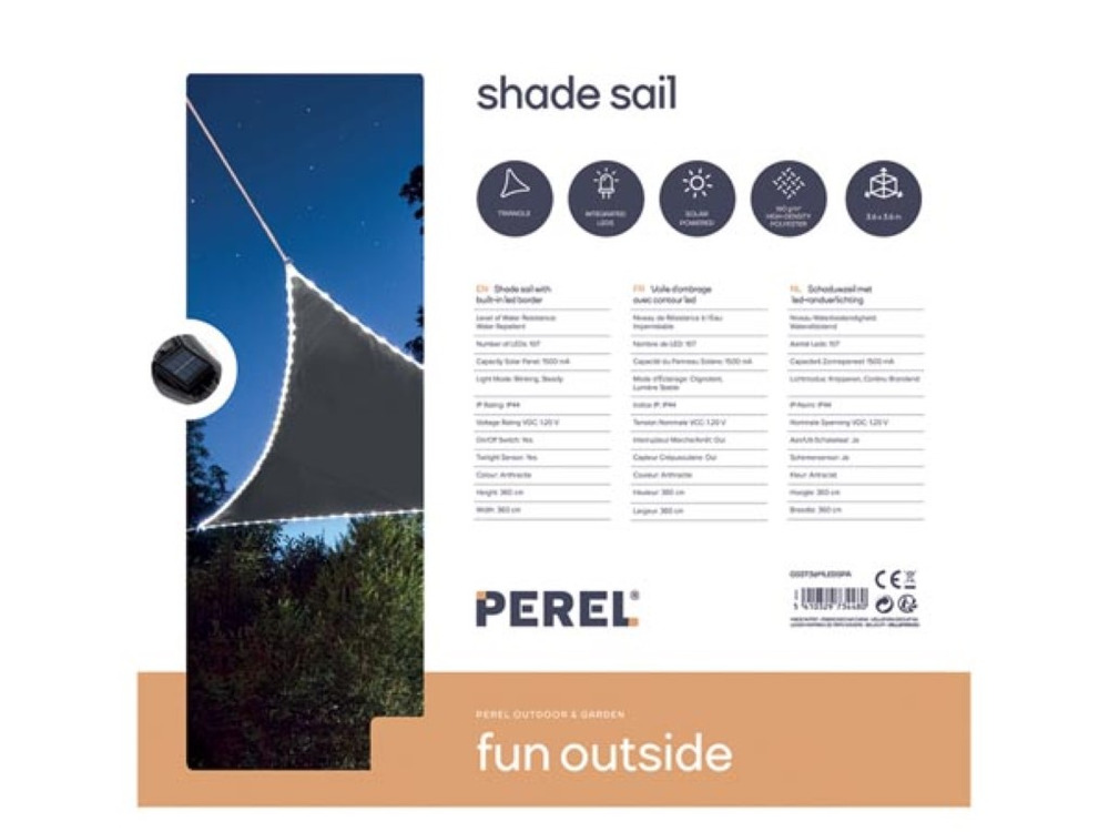 Enhance your outdoor space with the Zonnezeil met LED-randverlichting. This triangular shade sail, measuring 3.6 x 3.6 x 3.6 meters, boasts a sleek anthracite color, blending functionality with style.