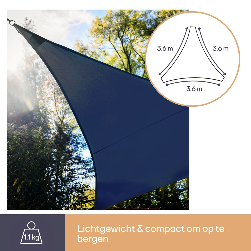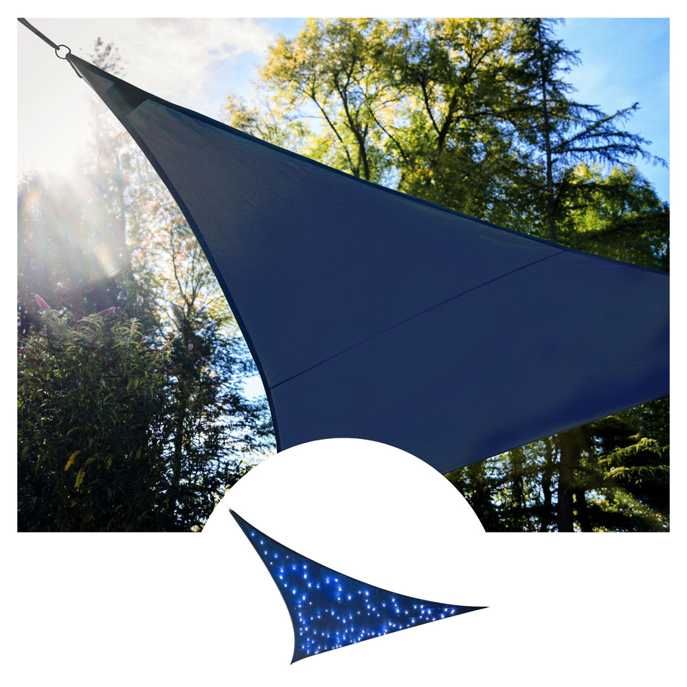 Transform any outdoor space with the striking Zonnezeil met LED-sterrenhemel. This triangular shade with dimensions of 3.6 x 3.6 x 3.6 meters features a captivating dark blue color, adding a modern touch to your patio or garden.